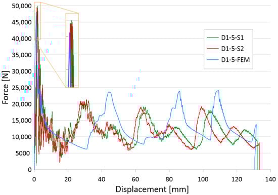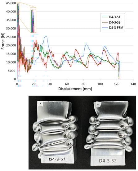 The quality of the verification results for sample D4-3, characterized by three holes with a diameter of 4 mm, was as high as for sample D1-5. The results are also presented in the form of force-shortening characteristics and a graphical presentation of crushed thin-walled samples (Figure 10). The verification of the above sample showed a slightly off-axis crush for sample S1. Due to the slight skewing of the sample, the characteristic shows an increase in the force waveform at the beginning of the crush. The magnitude of the second force peak is larger, indicating that a higher value of mechanical energy was absorbed in this stage. This is related to the shape of the characteristics at the later stage of the crush for the curve defined in green. Despite this behavior of the sample, the shortening value seen in Figure 10 is almost identical for both verified cases, which confirms its good energy-absorbing capabilities, which resulted in the biomechanical properties. Due to the magnitude of the force that was generated, it affects overload that is unsafe for human life during accidents and hence, there is a real correlation between crush-initiating elements and passenger safety. The comparison of numerical results with experimental data allowed us to draw similar conclusions. The convergence of characteristics was at a high level, and the values of absorbed energy at the various stages of crushing refer to each other.