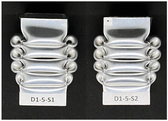 This study shows that samples S1 and S2 reproducibly illustrated the behavior of a passive energy absorber. For both samples, the force peaks occurred at the same location on the thin-walled column, which corresponds to the specified shortening of the sample. The values of absorbed mechanical energy by individual plastic hinges correspond to each other. The total shortening of the specimen for all curves in Figure 9 corresponds to the other verified cases. In the experimental study, there was a noticeable tendency for the plastic hinge to split into a force peak, visible on the graph, and a subsequent force spike, which relates to a single peak on the graph for numerical analysis. This effect may have been due to the finite element method. The method simplifies the results used to some extent and the mesh used, and the size of the finite element defines the accuracy of the obtained results. If a very fine element was used, the accuracy of the results could be affected, but the analysis time would be significantly increased and the computational cost would be much higher.
