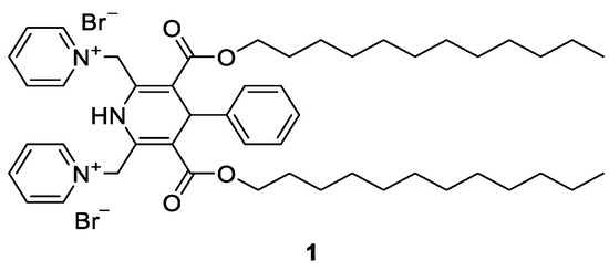 Structure of 1,4-DHP amphiphile—1,1′-{[3,5-bis(dodecyloxycarbonyl)-4-phenyl-1,4-dihydropyridine-2,6-diyl]bis(methylene)}bis(pyridin-1-ium) dibromide (1).