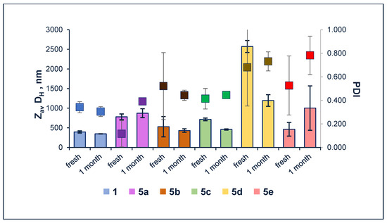 The average hydrodynamic diameters (ZavDH), polydispersity index (PDI), and stability of nanoparticles comprised of amphiphilic 1,4-DHP 1 and 5 were determined by the DLS method. The results for the freshly prepared samples and samples after storage at 4 °C for a month at concentration 0.1 mM are summarized in Figure 2 (data from Table S1, Supplementary Materials).