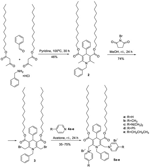 Firstly, a parent N-benzyl 1,4-dihydropyridine 2 was synthesised by the condensation of benzaldehyde, with two equivalents of dodecyl acetoacetate using phenylmethanamine hydrochloride as a nitrogen source instead of ammonia and pyridine as a solvent, under reflux for 30 h. Bromination of the 2,6-methyl groups of the N-benzyl 1,4-DHP 2 was performed by N-bromosuccinimide (NBS), similarly to a previously described procedure [27]. A solution of NBS in methanol was added dropwise to a solution of 2,6-dimethyl-1,4-DHP 2 in methanol, the reaction mixture was stirred at r. t. for 24 h, and the completion of the reaction was monitored by TLC. The desired N-benzyl substituted 2,6-bis(bromomethyl)-1,4-DHP 3 was obtained with a yield of 74%. The last step—bromine nucleophilic substitution with pyridine derivatives—was performed in acetone by stirring the reaction mixture at the room temperature for 24 h. This step gave the target N-benzyl 1,4-DHP amphiphiles 5 with yields of 35–75% depending on the pyridinium substituent structure.