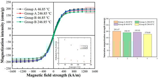 Moreover, it can be seen from Figure 1 that the coercivity of soft magnetic particles decreases significantly with the increase in temperature. During the temperature increase from 46.5 °C to 246.5 °C, the coercivity of Sample A is reduced from 4.6 kA/m to 0.58 kA/m, with a more significant decrease of 87.4%. The coercivity of Sample B is reduced from 0.887 kA/m to 0.3193 kA/m, representing a 64% reduction. The composite systems composed of CIPs and nanoparticles exhibit low coercivity and relatively small dropouts at room and high temperatures. This indicates a good enhancement effect on the preparation of magnetorheological fluids.