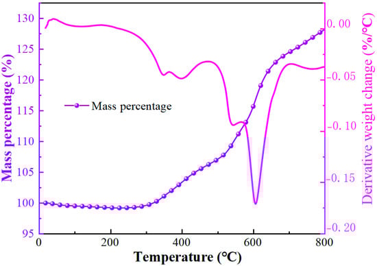The TGA curve of soft magnetic particles from 25 to 800 °C.