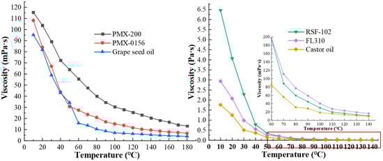 As shown in Figure 3, the dynamic viscosity of the six samples has a linear relationship with temperature. The dynamic viscosity of PMX-200, PMX-0156, and Grape seed oil decreases sharply in the range of 10–60 °C and the decrease slows as the temperature approaches 70–180 °C. The dynamic viscosity of RSF-102, FL310, and Castor oil (at room temperature) decreases more sharply than the others. The silicone oils have better performance than the other kinds of base carrier fluids. When the temperature is raised from 10 °C to 140 °C, the viscosity of the samples decreases by 82%, 0.91%, 0.998%, 0.994%, 0.944%, and 0.994%.