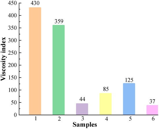 When the temperature rises, the arrangement of molecular spacing within the fluid is damaged, the kinetic energy between fluid molecules increases, the molecular spacing becomes more significant, the internal friction resistance decreases, and the viscosity of the liquid decreases. The viscosity index is commonly used to describe the degree to which the viscosity of a fluid changes with temperature. The higher the viscosity index, the less the viscosity of the fluid is affected by temperature. The viscosity indices of the six samples can be obtained from Figure 4, and the viscosity indices of the six base carrier fluids are PMX-200 (430) > PMX-0156 (359) > Grape seed oil (125) > FL310 (85) > RSF-102 (44) > Castor oil (37). It can be seen that the viscosity indices of PMX-200 and PMX-0156 are 344% and 287.2% of that of Grape seed oil, respectively, with excellent high-temperature stability.