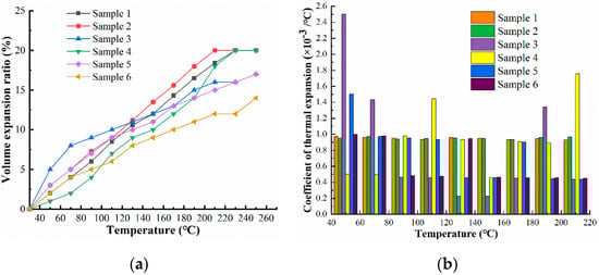 It can be seen from Figure 6 that when the temperature ranges from 10 °C to 250 °C, the expansion volumes of the base carrier fluids increase with the increasing temperature, and the relationship is approximately linear. In the range of 10 to 210 °C, the expansion rates of the six samples are 18.4%, 20%, 16%, 18%, 15%, and 12%, respectively. Although the expansion rates of PMX200 and PMX-0156 are larger, silicone oil has a stable change with the thermal expansion coefficient, which remains at about 0.95 × 10−3/°C in the range of 10 to 200 °C.