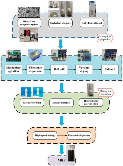 The preparation process of MR fluids is shown in Figure 8. The soft magnetic particles and surfactants were thoroughly mixed in anhydrous ethanol by a stirrer, ultrasonic disperser, and ball mill. The surfactant completely enveloped the soft magnetic particles. The whole wrapping process lasted 4 h and was carried out at 40 °C. Then, the mixture was dried in a vacuum drying oven at 80 °C for three hours. After that, the mixture was dispersed using a ball mill, and the modified soft magnetic particles were obtained. Finally, the modified particles, hydrophobic fumed silica and dimethyl silicone oil were thoroughly mixed by high-speed stirring and ultrasonic dispersion for 4 h. The soft magnetic particles were uniformly dispersed in the base carrier fluid. The whole dispersion process was carried out using an oil bath to ensure a constant temperature of 40 °C.