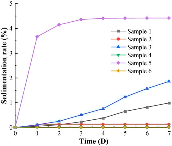 As shown in Figure 9, the sedimentation stability of Sample A deteriorated sharply with increasing temperature. The seven-day maximum sedimentation rate of Sample A at room temperature was 0.99%. The seven-day maximum sedimentation rate was 1.86% in working condition 3, which was about 188% of that at room temperature. The maximum seven-day sedimentation rate of Sample A was 4.42% in working condition 5.