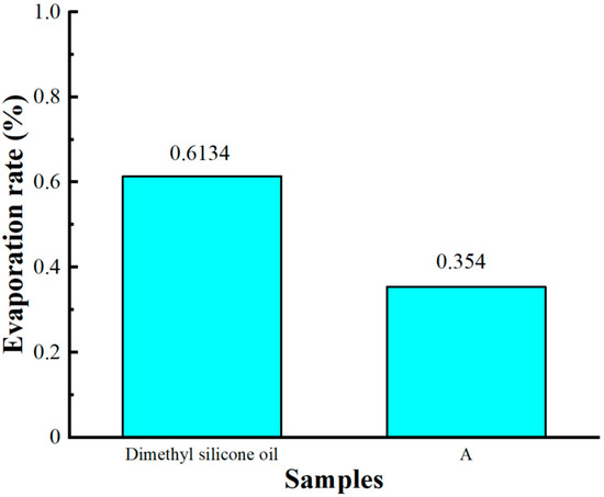 As shown in Figure 10, the evaporation rate of dimethyl silicone oil was 0.6134%, and that of Sample A was 0.354% in the same experimental conditions. Among the components of the MR fluid, the soft magnetic particles are denser and have a higher Curie point, making them less prone to chemical reactions at 250 °C. The overall content of surfactants was low and negligible. The base carrier fluid is prone to evaporation in a high-temperature environment, and the weight loss of the MR fluid is mainly attributable to the evaporation of the base carrier fluid. At 250 °C, the micro-nano composite system was almost entirely free from oxidation, and the prepared samples had good high-temperature stability.