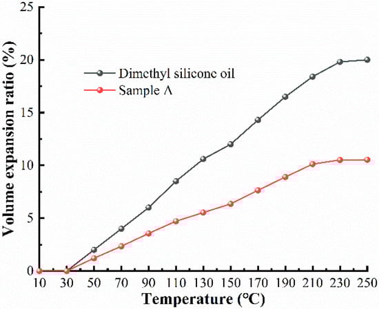 It can be seen from Figure 11 that the expansion rate of MR fluids gradually increased with increasing temperature, and the expansion trend was similar to that of dimethyl silicone oil. When the temperature was 250 °C, the MR fluid expansion rate reached 10.53%. This was mainly due to the influence of temperature on the base carrier fluid, whose atomic structure spacing increased with enhanced thermal motion and liquid volume expansion. After the temperature reached 210 °C, the expansion rate of both samples stopped increasing, mainly due to the thermal evaporation of the base carrier fluid.