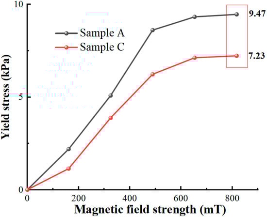 The rotational rheometer MCR 301 equipped with MRD 180 by ANTON PAAR (Austria) was used to obtain the rheological curves of Sample A and the general MR fluid (Sample C). The Herschel–Bulkley model with better fitting effects [30] was applied to obtain the shear yield stress of the MR fluid, as shown in Figure 13.
