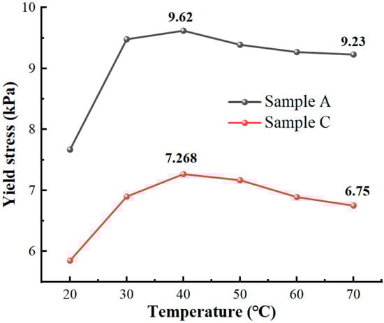 The variation pattern of the viscosity–temperature curve for MR fluids is similar to that of the base carrier fluid. At the same time, it can be seen from Figure 12 that the zero-field viscosity of Sample C is lower than that of Sample A, and its temperature change curve is smoother. The viscosity of MR fluids changes sharply when the temperature drops from 100 °C to 20 °C; that of Sample A changes from 0.522 Pa·s at 100 °C to 1.782 Pa·s at 20 °C, and that of Sample C from 0.633 Pa·s at 100 °C to 1.984 Pa·s at 20 °C. This is mainly due to the smaller average particle size of the micro-nano composite system in Sample C compared to that of the CIPs, and the smaller particle size helps to improve the zero-field viscosity of the magnetorheological fluid. The high temperature decreases the zero-field viscosity of MR fluids. The increasing temperature will lead to increased thermal movement of molecules inside the liquid, which decreases the zero-field viscosity. The zero-field viscosity of Sample A is higher than that of Sample C in the same working conditions. The zero-field viscosity of both samples continues to decrease as the temperature increases. The high temperature will reduce the viscosity of MR fluid, which is undoubtedly a favorable change.
