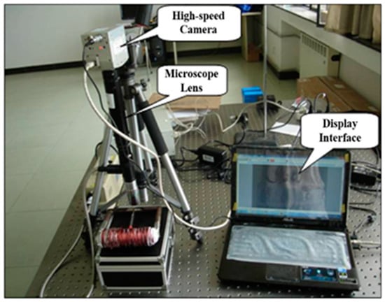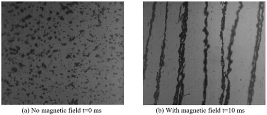 In order to observe the microscopic manifestation of the rheological effect of magnetorheological fluid and the time response characteristics, a high-speed photomicrographic imaging test bench was established, as shown in Figure 15. The high-speed photomicrographic imaging test bench was mainly composed of a high-speed camera, microlens, and magnetic field generator. The specific response time of the magnetorheological fluid particles under the action of a magnetic field could be obtained by the joint triggering of a high-speed camera and a magnetic field generation device. In Figure 16, it can be seen that the particles were rapidly arranged in chains along the direction of the magnetic field, and the response speed was fast. The particles reached the chain state at about 10 ms, and the response time changed on the order of milliseconds. The response time of the prepared MR fluids was excellent.