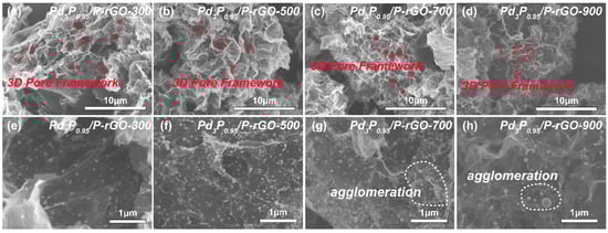 SEM images of 3D Pd3P0.95/P-rGO prepared at different thermal reduction temperatures (300, 500, 700, 900 °C): (a,e) Pd3P0.95/P-rGO-300, (b,f) Pd3P0.95/P-rGO-500, (c,g) Pd3P0.95/P-rGO-700, and (d,h) Pd3P0.95/P-rGO-900.