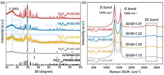 (a) XRD patterns and (b) Raman spectra of 3D Pd3P0.95/P-rGO prepared at different thermal reduction temperatures (300, 500, 700, 900 °C).