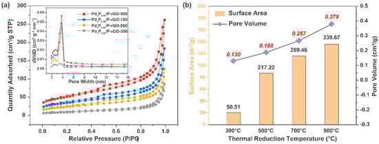 Figure 3 exhibits the N2 adsorption–desorption curves of the 3D-configuration Pd3P0.95/P-rGO-Y (Y = 300, 500, 700, 900) prepared at different thermal reduction temperatures, and the inset shows the particle size distribution. The N2 adsorption–desorption curves of the Pd3P0.95/P-rGO-Y (Y = 300, 500, 700, 900) at 77 K showed the characteristics of a type IV isothermal adsorption line, and an obvious hysteresis phenomenon occurred during the N2 desorption of the four samples, which indicated that the material had a rich pore structure, that is, a large number of mesopores existed. We found that the average pore sizes of the four samples were all distributed around ~3.8 nm, except for Pd3P0.95/P-rGO-300, in which the number of 3.8 nm mesopores was lower, as shown in the inset in Figure 3a. Figure 3b shows the specific surface area and pore volume of Pd3P0.95/P-rGO-Y (Y = 300, 500, 700, 900). Pd3P0.95/P-rGO-900 had the largest surface area and pore volume at 339.67 m2/g and 0.379 cm3/g, respectively. The specific surface area and pore volume of Pd3P0.95/P-rGO-300 decreased to 50.51 m2/g and 0.130 cm3/g, respectively, when the thermal reduction temperature dropped to 300 °C. With the decrease in the thermal reduction temperature, Pd ions could not be reduced to obtain the expected palladium phosphide, and nor could the oxygen-containing groups be completely reduced.