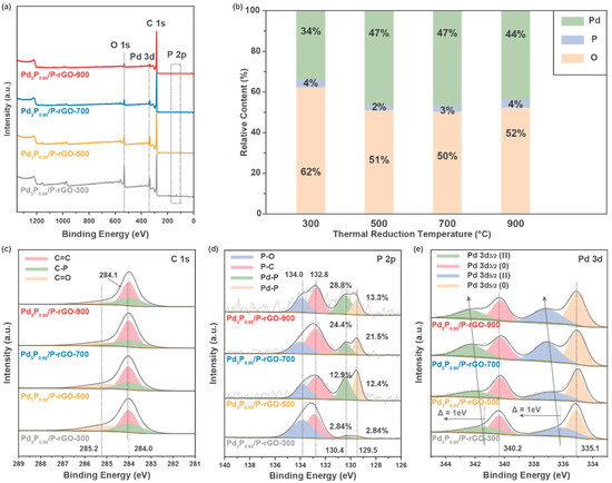 XPS spectra of 3D Pd3P0.95/P-rGO-Y (Y = 300, 500, 700, 900 °C) prepared at different thermal reduction temperatures: (a) survey spectra, (b) the relative content of each element, (c) C 1s, (d) P 2p, and (e) Pd 3d orbitals.