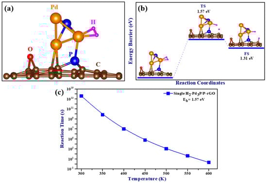 (a) The optimized structure of H2 adsorbed on Pd3P/P-rGO; (b) the minimum energy path (MEP) for the spillover of hydrogen on Pd3P/P-rGO; and (c) single H2-Pd3P/P-rGO spillover reaction time as a function of temperature (TS: transition state, FS: final state).