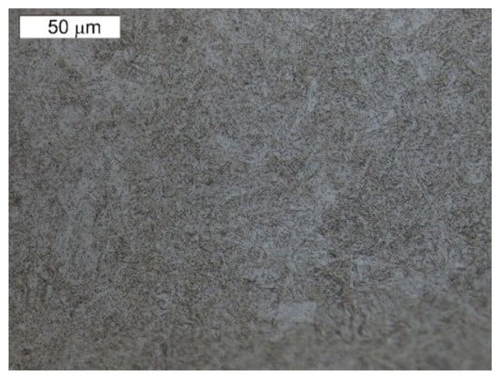 Microstructure of the tested tool’s material. Visible tempering martensite. Light microscopy, etched.
