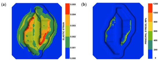 The C-L criterion is successfully used to predict fracture in metal forming processes. It is assumed that the material is going to crack when the critical plastic strain is exceeded. The performed numerical analyses showed that in the area of fracture, the material of the tools deforms both elastically and plastically. Figure 5 shows an elastic strain and principal stress distribution on the surface of tool during forging. The proposed modification of the C-L criterion assumes the inclusion of both elastic and plastic strain components in the criterion.