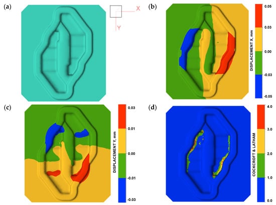 The boundary conditions for the simulation of the forging were selected based on the analysis of the industrial process. The modified X37CrMoV51 (1.2343) steel model was adopted as the material of the tools. The first mechanism of fracture was dependent on the displacement of the tool material connected with elastic deformation. As shown in Figure 6b,c, deformation of the tool was observed in different directions. From the point of view of the fracture, the most important is the boundary line between the positive and negative values of displacement in the analysed direction (Figure 6a). Figure 6b presents the displacement distribution in X direction. The boundary between the positive and negative values of displacement is located in the fracture line in Area A (Figure 6b).