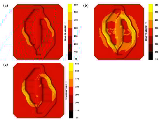 Temperature field distributions (a) at the beginning of the forging process—position of the forging, (b) initial forming phase, and (c) final forming phase.