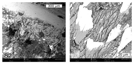 On the basis of the preliminary macroscopic tests, for the analysis of the operation surfaces, sample 5b was selected because of its clear traces of wear and its location in the central part of the tool. The analysed areas have been marked with symbols from S1 to S6. Macroscopically, on the external operation surface, clear surface changes were observed (Figure 8). Both the working impression and the bridge of the insert, most exposed to wear, exhibited on their operation surfaces traces of plastic deformation as well as cracks suggesting the occurrence of thermal fatigue (area S2). On the edge of this area, spallings of the tool surface were observed (area S1)—Figure 9.