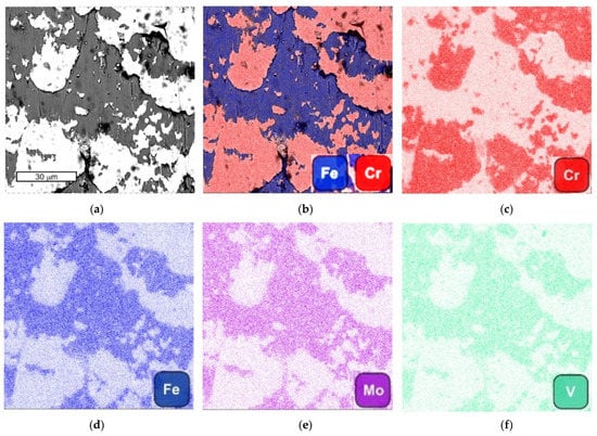 The view of (a) SEM image, (b) combined SEM image with iron and chromium distribution; (c) chromium distribution; (d) iron distribution; (e) molybdenum distribution; and (f) vanadium distribution; SEM/EDX.