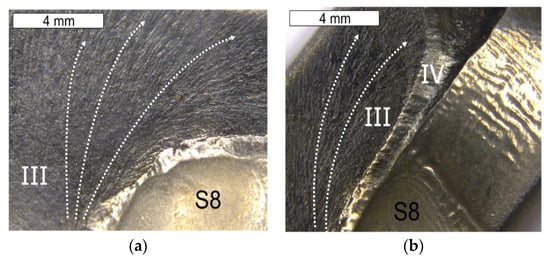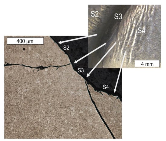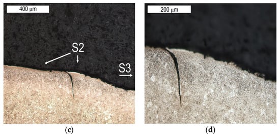 This led to the formation of characteristic grooves arranged along the direction of the plastic material flow of the surface layer. Directly behind that area, a fatigue crack propagated along the change of the tool profile in area S3. In the FEM analyses, the highest material effort was observed in these areas (Figure 5d). In the remaining area of the lower part of the tool (S4), typical abrasive wear was observed, which led to a significant material loss (Figure 3). We cannot exclude the possibility that these areas also underwent plastic deformation; however, the processes of tribological wear demonstrated a higher intensity in this area. This resulted in the formation of irregularities on the external surface of the tool, which were not accompanied by plastic demonstration. These areas constituted potential notches favouring the initiation of cracks (Figure 17 and Figure 18).