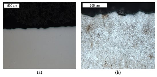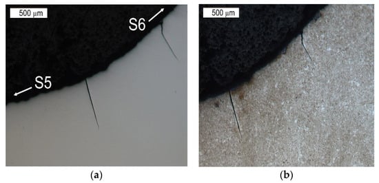 Visible cracks propagating in different directions accompanying the spalling observed in the SEM image in Figure 8 (element 5b). Light microscopy: (a) non-etched; (b) etched.