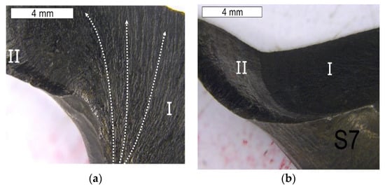 Surface of the fracture of element 3a. Fracture with visible so-called chevron marks, beginning from the area of the crack’s propagation (a). A visible auxiliary fault accompanying the fracture shown in Figure a (b). Stereoscopic microscopy.
