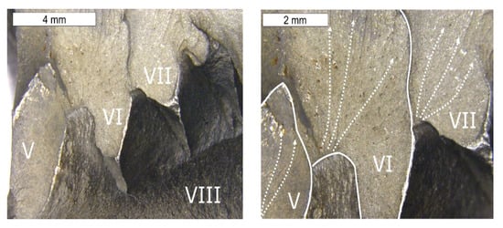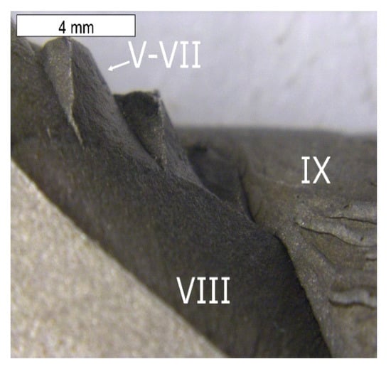 The fractographic tests were performed based on the fracture separating element 3a and 3b, as well as the fracture formed on element 2a. The created fracture is multi-plane and multi- origin. Along the edge of the crack’s beginning, numerous ratchet marks occur. The crack initiated as a fatigue crack further propagates as a brittle crack with clear chevron marks, which are formed in the case of plastically formed elements (Figure 19, Figure 20, Figure 21 and Figure 22). The surface of the fatigue area is very narrow, which is connected with the significant overloads exerted onto the tool. Figure 19 shows the direction of crack propagation from the focus across plane I. The origin is constituted by the internal surface of the insert die, from which the crack propagated into the material. At the last stage, a change of its direction took place and plane II was created. The fractures located opposite them (III, IV) have been presented in Figure 19. Area III of the fracture constitutes a counter-surface for area I, whereas the fracture area marked as IV—for area II. The crack was initiated in the area of the section change, constituting zones of local stresses. The crack propagation in the brittle crack in unstable and for this reason, the initiated crack can propagate through the whole tool section even under the effect of internal stresses and even with reduced external stresses. Figure 20 shows the fracture area separating different planes of the forming crack on element 2a. The areas (V–VII) present the fracture zones which were connected with the propagation of a crack from tool surface S5 and the formation of ratchets as a result of a change of the crack trajectory. The change in the direction of the crack propagation should be connected with the change in the section of the examined die occurring in this area. A different area (IX) was formed as a result of the development and propagation of another fatigue crack. The macroscopic observations revealed in this area the presence of certain features typical of ductile fractures. In this area, despite the macroscopically brittle character of the immediate zone, locally, it was possible to observe traces of plastic deformation (Figure 21). The secondary ridges forming the chevron marks are parallel to the direction of crack growth and demonstrate traits of plastic deformation leading to the formation of delamination in the fracture surface. The third zone (VIII) constitutes a crack whose front was ended in areas V–VII. All the independently developing cracks met, forming an expanded surface topography (Figure 22).