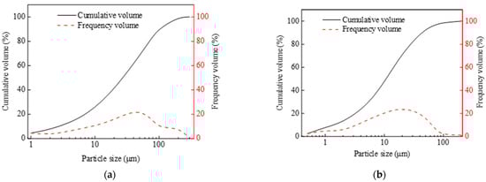 Sodium hydroxide (NaOH, 99 wt.%) and sodium silicate (Na2SiO3) solution (SiO2 = 27.7%, Na2O = 8.8%, and water = 63.5%, supplied by Changlong Alkali Factory, Gongyi, China) were mixed at a mass ratio of 0.15 to prepare alkali activator solution with a SiO2/Na2O molar ratio of 1.4. FA and GGBS were used as cementitious materials. The FA used in this study was class F with a specific surface area of 357.0 m2/kg and density of 2.6 g/cm3. The GGBS used in this study was class S95 with a specific surface area of 610.6 m2/kg and density of 2.9 g/cm3. The chemical compositions of the GGBS, as measured in an X-ray fluorescence (XRF) analysis, are shown in Table 1. The particle size distribution of FA and GGBS obtained by laser particle analyzer (Type: Mastersizer 3000; Malvern Panalytical Company, Malvern, UK) is shown in Figure 1. SEM images of FA and GGBS are shown in Figure 2. PE and PVA fibers were used as reinforcement materials in the mixtures. The properties of PVA and PE fibers are listed in Table 2. In addition, the ordinary Portland cement (P.O.42.5), river sand (fine aggregate) with fineness modulus of 2.88, and crushed limestone (coarse aggregate) with a diameter of 5–20 mm were used to produce existing concrete with a strength grade of C30.