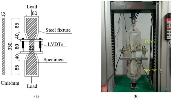 Dog-bone samples were used for uniaxial tensile tests with reference to the recommendations of the Japan Society of Civil Engineers [33]. A servo hydraulic universal testing machine (maximum load capacity: 2 kN Type: UTM6203, Suns Technology Company, Shenzhen, China) was used for the test. Figure 3 shows the dog-bone sample size and test setup. During the test, the dog-bone sample bore the tensile load, and the displacement rate was adjusted to 0.20 mm/min. Two linear variable differential sensors (LVDTs) with a range of 10 mm were installed in the tensile section of the tensile samples to monitor the displacement. The load and displacement data of the dog-bone samples were recorded by the computer. The tensile stress was obtained by dividing the tensile load by the cross-sectional area of the dog-bone sample tensile section, and the tensile strain was obtained by dividing the tensile displacement by the gauge length (80 mm), so as to draw the stress–strain curve. The tensile stress and tensile strain can be calculated by Equations (2) and (3), respectively. The maximum tensile stress of dog-bone sample and its corresponding tensile strain were denoted as the ultimate tensile stress and ultimate tensile strain, respectively.
