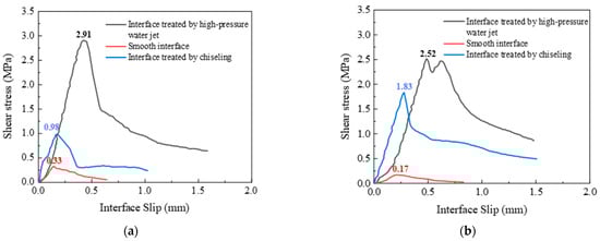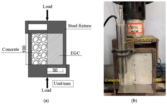 The shear resistance of the interface between existing concrete and EGC was studied using the single shear bonding test, as shown in Figure 5. The 50 mm × 100 mm × 100 mm C30 concrete block was cast in advance, on which the interface roughness treatment (high-pressure water jet and chiseling machine) was carried out after curing for 28 days. Then, the 50 mm × 100 mm × 100 mm EGC sample was cast and cured for 28 days to form a cube sample of 100 mm × 100 mm × 100 mm for use in the single shear bonding test. A servo hydraulic universal testing machine (Type: WDW-100, maximum; load capacity: 100 kN; manufacturer: Suns Technology Company, Shenzhen, China) was used for the test. The displacement rate was controlled at 0.25 mm/min. The maximum shear load and relative slip of samples were recorded, based on which the shear stress–interface slip curve was drawn. The ultimate shear strength was calculated according to Equation (5):
