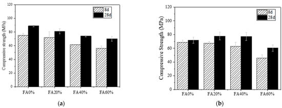 Figure 6 shows the compressive strength results of PVA and PE-fiber-reinforced EGCs with different FA contents. It can be seen from Figure 6a that, for PVA-fiber-reinforced EGC, with the increase in FA content, the compressive strength at the age of 8 and 28 days decreases, and the mix with 0% FA has the highest compressive strength at 75 MPa and 89 MPa, respectively. It can be seen from Figure 6b that, for PE-fiber-reinforced EGC, with the increase in FA content, the compressive strength at the age of 8 days decreases. Additionally, with the increase in FA content, the compressive strength of the sample at the age of 28 days first increases and then decreases. The mix with 20% FA has the highest 28-day compressive strength of 79 MPa, which may be due to the best formation of aluminosilicate hydrate and calcium silicate hydrate (C-S-H) gels [35]. The decrease in compressive strength caused by 60% FA may be due to the high content of FA reducing the reaction activity [36]. Meanwhile, it can be seen from Figure 6 that the compressive strength of PVA-fiber-reinforced EGCs with the same FA content is higher than that of PE-fiber-reinforced EGCs. This could be due to the lower aspect ratio of the PVA fibers than the PE fibers, which suggests that the PVA fibers may induce less fiber damage (air entrapping effect) in the composites compared to the PE fibers [37].