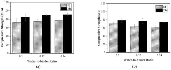 FA0%-PVA and FA40%-PE samples were selected to analyze the influence of water–binder ratio. Figure 7 shows the compressive strength results of PVA and PE-fiber-reinforced EGC with different water–binder ratios. As shown in Figure 7a, for PVA-fiber-reinforced EGC, with the increase in water–binder ratio, the compressive strengths at 8 and 28 days show an upward trend. Compared to the sample with a water–binder ratio of 0.30, the 8-day compressive strengths of the samples with water–binder ratios of 0.32 and 0.34 increased by 3% and 6%, respectively; the 28-day compressive strengths of the samples with water–binder ratios of 0.32 and 0.34 increased by 6% and 7%, respectively. This phenomenon may be due to the fact that the cementitious material is GGBS in the reaction system for FA0%-PVA, and when the water–binder ratio is 0.30, the initial reaction is violent and the fluidity is poor [38], so some GGBS is wrapped by the hydration products and cannot participate in the reaction, resulting in insufficient reaction and thus low compressive strength. With the increase in water–binder ratio, the fluidity of the EGC slurry is improved, and more GGBS participates in the hydration reaction, resulting in higher compressive strength.