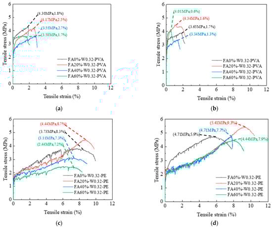 Tensile stress–strain curves of EGCs with different FA contents: (a) 8d-PVA, (b) 28d-PVA, (c) 8d-PE, and (d) 28d-PE.