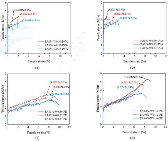 Tensile stress–strain curves of EGCs with different water–binder ratios: (a) 8d-PVA, (b) 28d-PVA, (c) 8d-PE, and (d) 28d-PE.