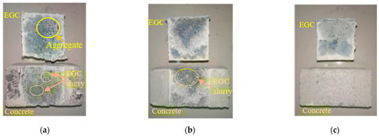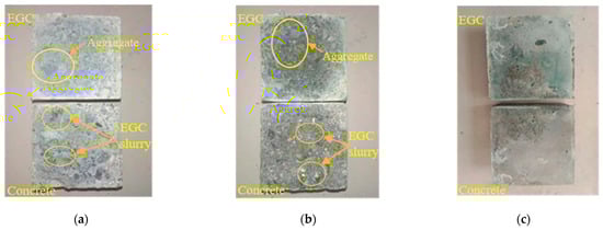 Figure 11 shows the tensile failure surfaces of different samples. From Figure 11a, it can be seen that dark green EGC slurry remains on the concrete when the interface is treated with the high-pressure water jet, and concrete aggregate remains on the surface of the EGC. Figure 11b shows that concrete grout remains on the EGC side at the chisel interface. Figure 11c shows that no slurry material remains on the concrete.