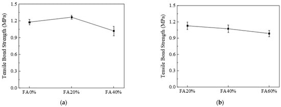 Effect of FA content on interfacial tensile bond strength; (a) W0.34-PVA and (b) W0.32-PE.