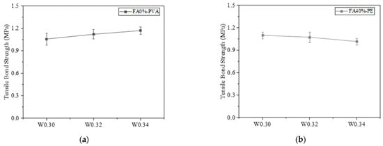 Effect of water–binder ratio on interfacial tensile bond strength: (a) FA0%-PVA and (b) FA40%-PE.