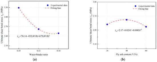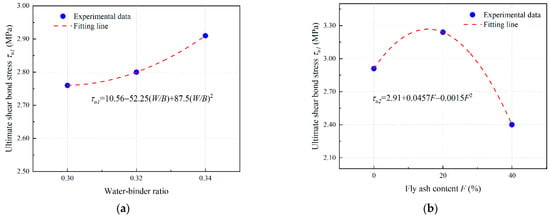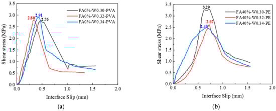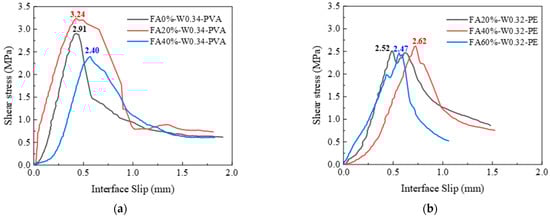 FA0%-W0.34-PVA and FA40%-W0.32-PE were selected as reference groups to explore the effects of interface treatment method, FA content, and water–binder ratio on ultimate shear strength due to their better mechanical properties.