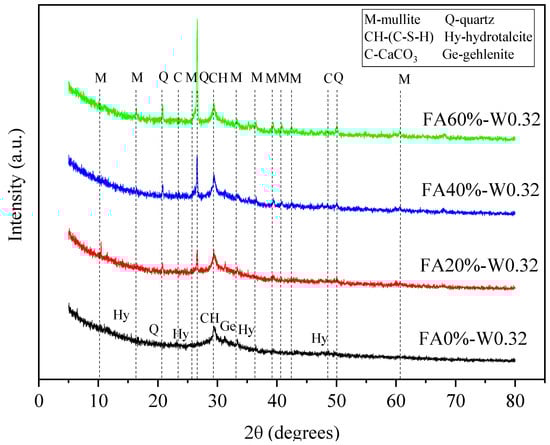 Figure 24 shows the XRD patterns of geopolymers with different FA contents. When the content of FA was 0%, the main reaction products of geopolymer were calcium silicate hydrate (C-S-H) (similar to riversideite, Ca5Si6O16(OH)2), abrazite (NaCa2Al5Si5O20∙6H2O), and hydrotalcite (Mg6Al2CO3(OH)16∙4H2O). With the addition of FA, mullite (Al6Si2O13) and hematite (Fe2O3) appeared, and their peak intensity increased with the increase in FA content. The peak intensity of C-S-H first increased and then decreased with the increase in FA content, in which 20% and 40% FA contents result in almost the same peak intensity. The results show that adding the proper amount of FA (FA20–40%) can enhance the reaction degree of geopolymer, but the addition of excessive FA (FA60%) can reduce the reaction degree.