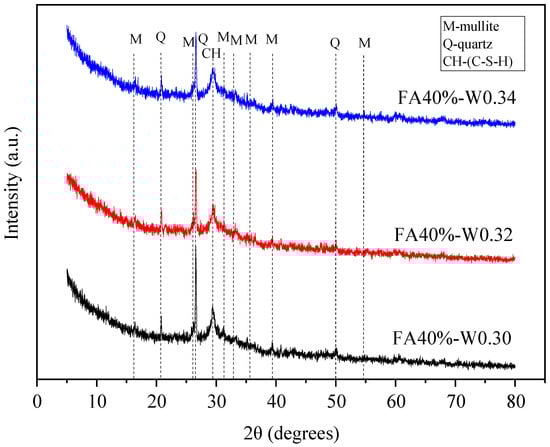 - The XRD studies showed that, when the FA content is 20–40%, the content of C-S-H gels is high and the reaction is sufficient. Additionally, the content of C-S-H gels decreases as the water-to-binder ratio increases from 0.30 to 0.34. That is, as the water-to-binder ratio increases, the concentration of the alkali activator solution decreases, resulting in a decrease in the degree of geopolymer reaction.