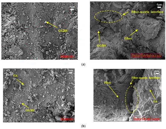 The effect of FA on the microstructure of EGC was studied by analyzing the SEM images of FA0%-W0.32-PE and FA20%-W0.32-PE. Figure 26 shows the SEM images of FA0%-W0.32-PE and FA20%-W0.32-PE at 28 days. The left images in Figure 26a,b show that, for both mixtures, there are a large amounts of gel-like reaction products in both matrix and interface area. Meanwhile, a small amount of unreacted spherical FA particles and irregular wedge-shaped GGBS particles can be observed. Figure 26b shows that only a small amount of FA particles is observed in the interfacial area. Generally, FA particles can be easily recognized in this system due to their spherical shape and low reactivity [45]. This shows that, for FA20%-W0.32-PE, most of the FA particles have participated in the reaction.