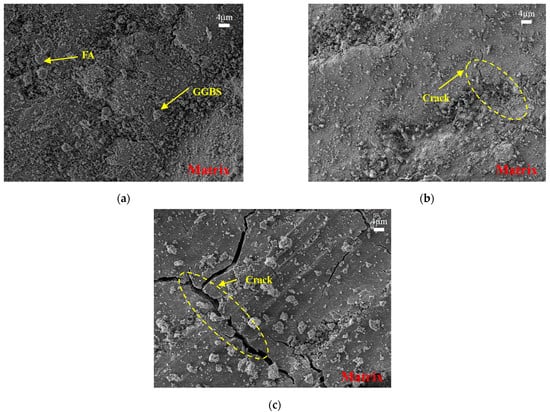 The effect of water–binder ratio on the microstructure of PE-fiber-reinforced EGC was studied by analyzing the SEM images of FA40%-W0.30-PE, FA40%-W0.32-PE, and FA40%-W0.34-PE at 28 days, as shown in Figure 27. It can be seen from Figure 27 that, with the increase in the water–binder ratio, the cracks in the EGC matrix gradually increased, and the compactness of the matrix gradually became worse. Therefore, PE-fiber-reinforced EGCs with a low water–binder ratio have a higher compressive strength.