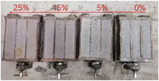 The mortars were cast into prismatic molds measuring 40 mm × 40 mm × 160 mm for casting and demolded after 24 h. The mortar specimen color changed with the changes in the RBP replacement rate, as shown in Figure 2; with increased RBP replacement rates, the color of the cement-mortar specimens gradually changed from grey to pink (from right to left). All of the samples were placed in a testing environment room until they reached a certain age (3 d, 7 d, or 28 d), and they were held at a constant temperature of approximately 20 °C ± 1 °C and under a constant relative humidity (RH) ≥ 90%.