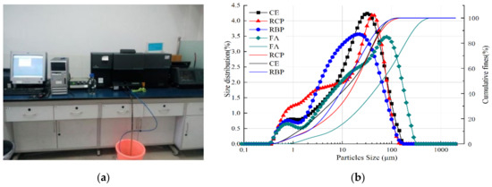 Particle size distribution. (a) LS-230 laser particle analyzer; (b) Particles size distribution of materials.
