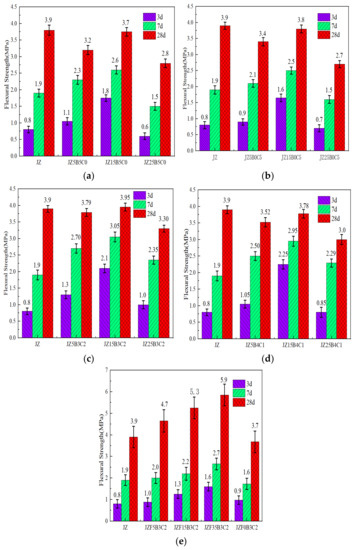 Flexural strength of cement-fly ash mortar containing the RBP or RCP. (a) mortar with RBP; (b) mortar with RCP; (c) mortar with HRP-I; (d) mortar with HRP-II; (e) HRP-Ireplacement fly-ash.